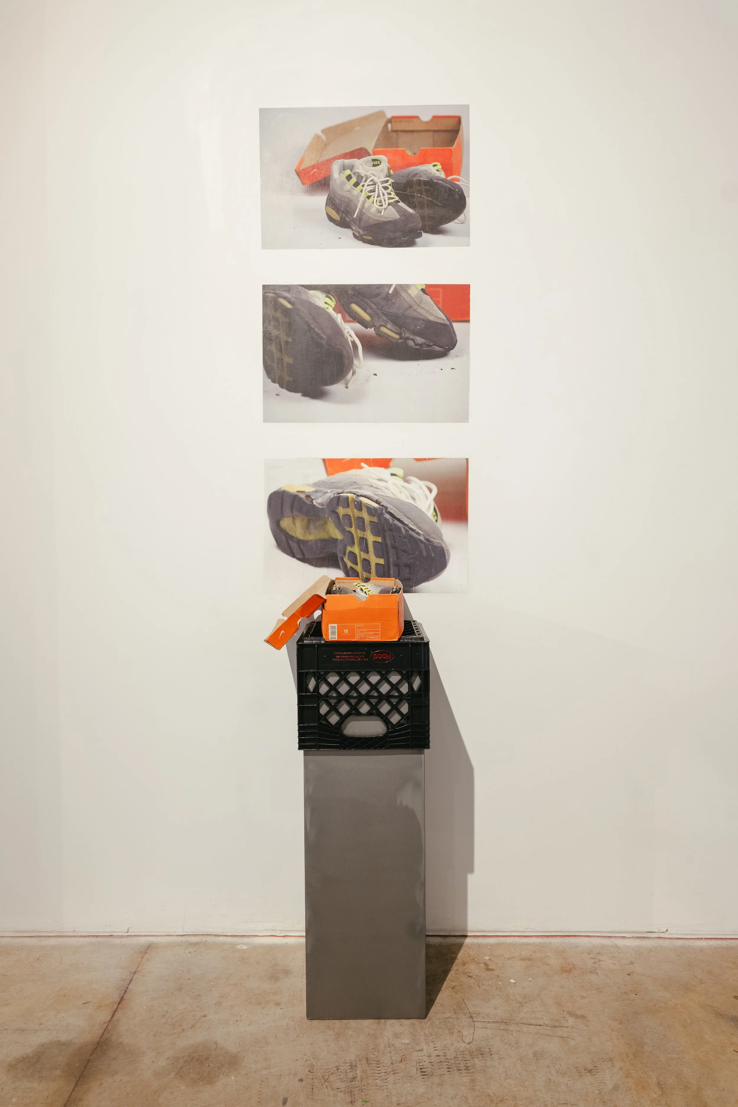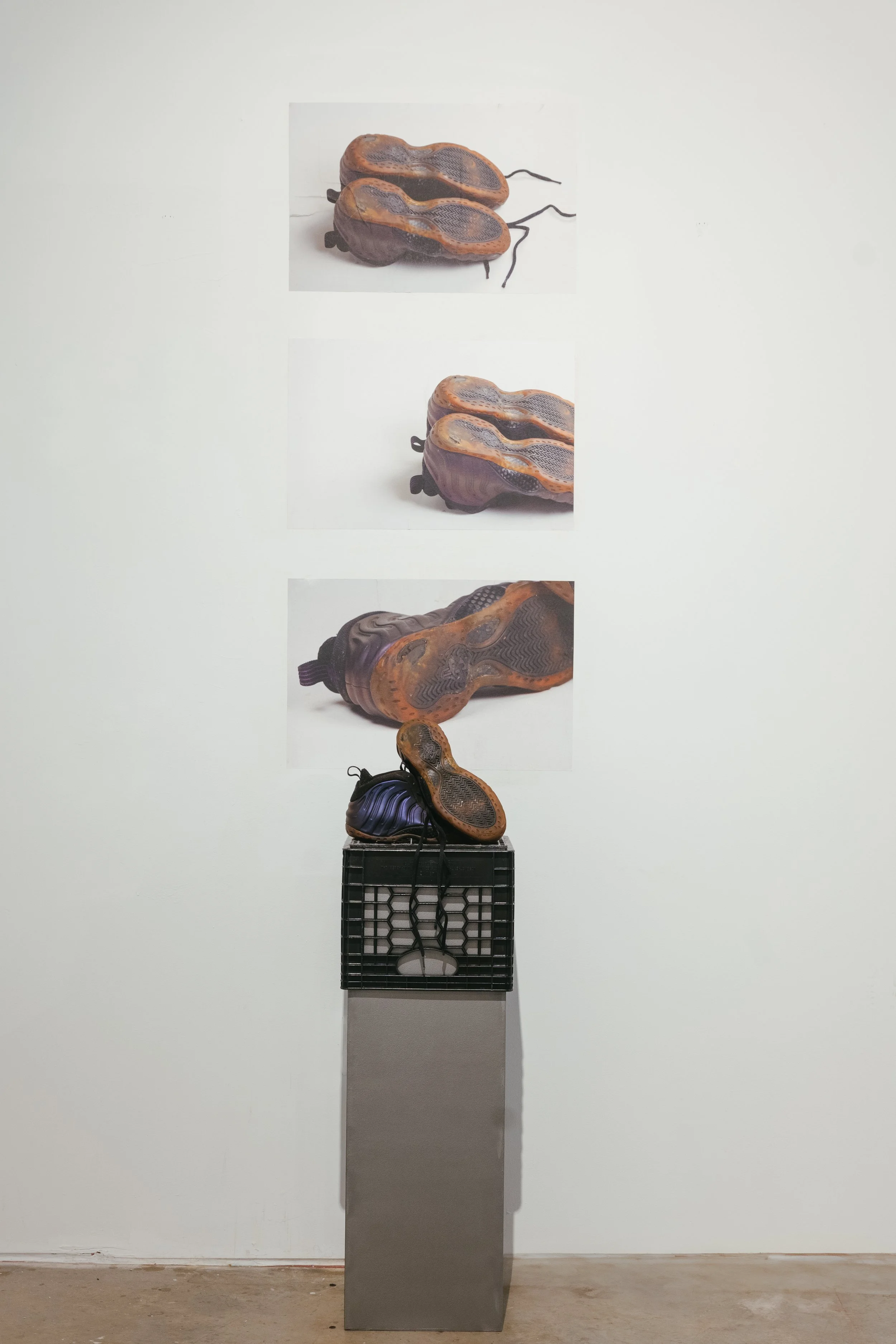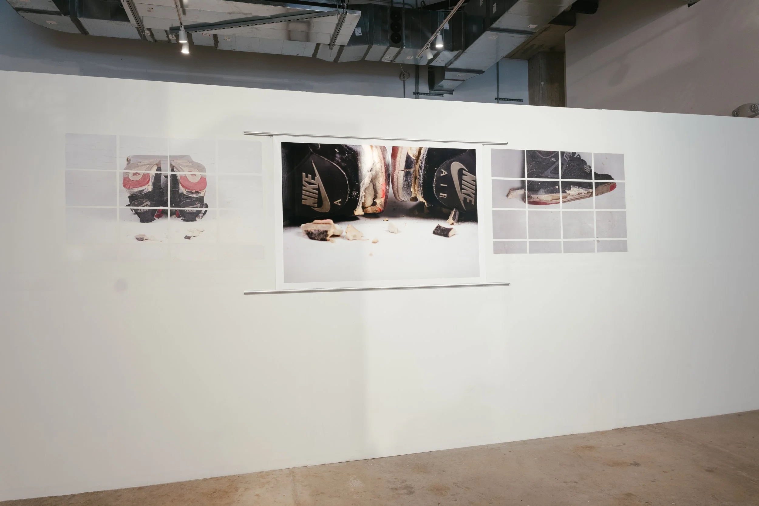 My presentation, Sole Cycle, included 25 images, 3 large prints (36x48), 22 images applied using wheatpaste (4 images - grid format [36 x 48], 6 images [18 x 27], 12 images [8.5 x 14]). The use of wheatpaste is a nod to guerrilla marketing and how these items are marketed and promoted to us, across genres (sneakers, sports, music, etc.). My choice to photograph these specific sneakers was due to their historical importance, as well as their personal significance to me.