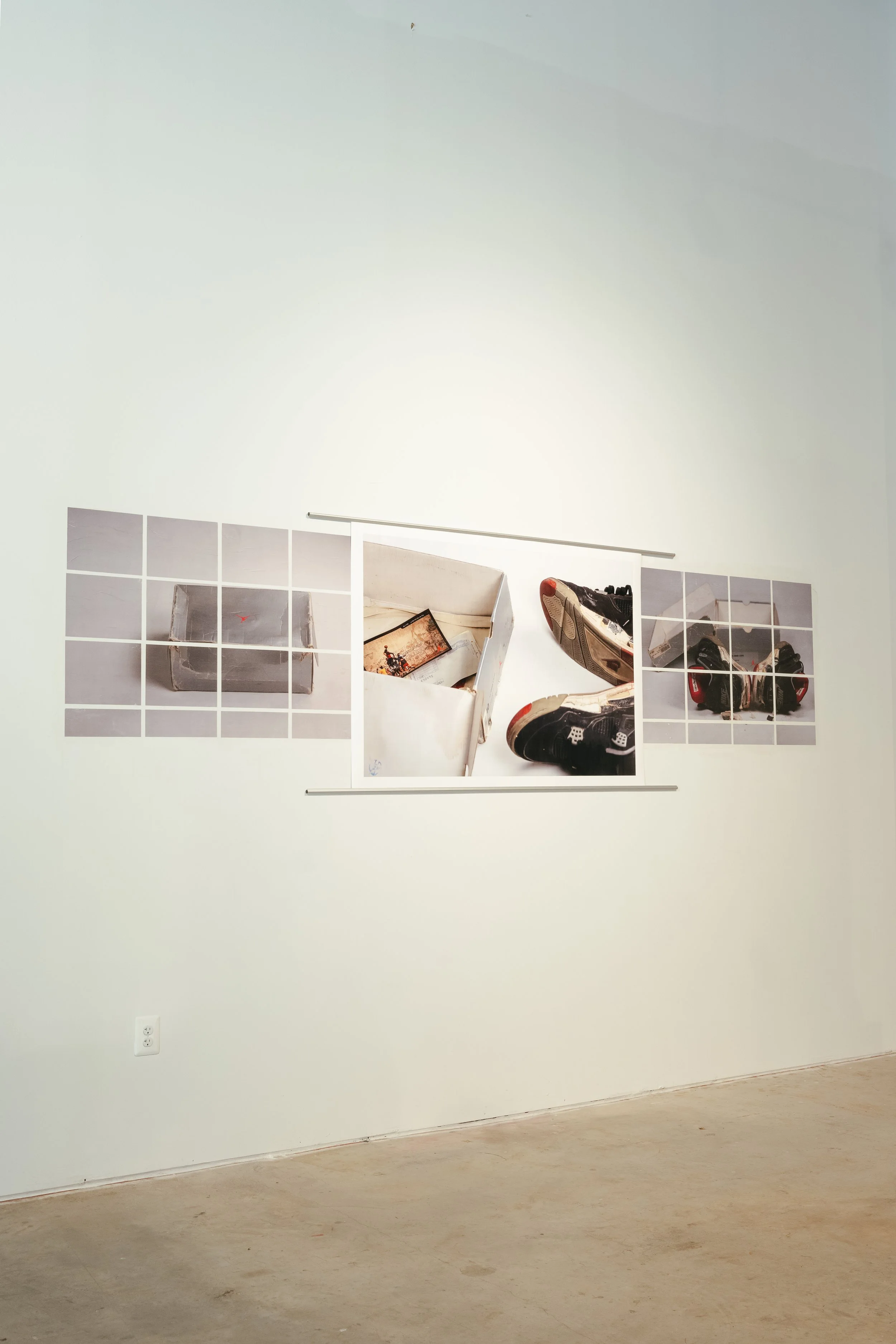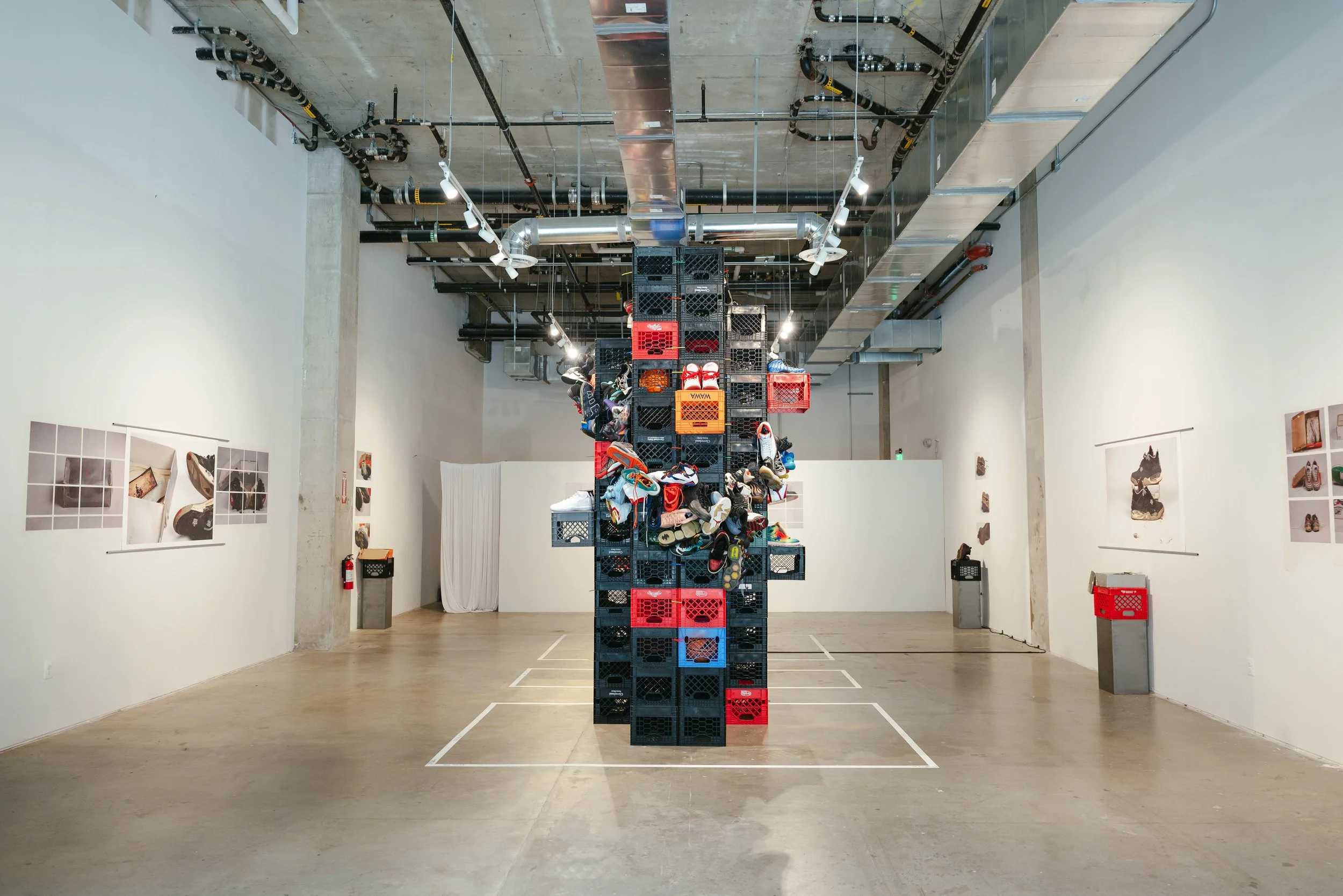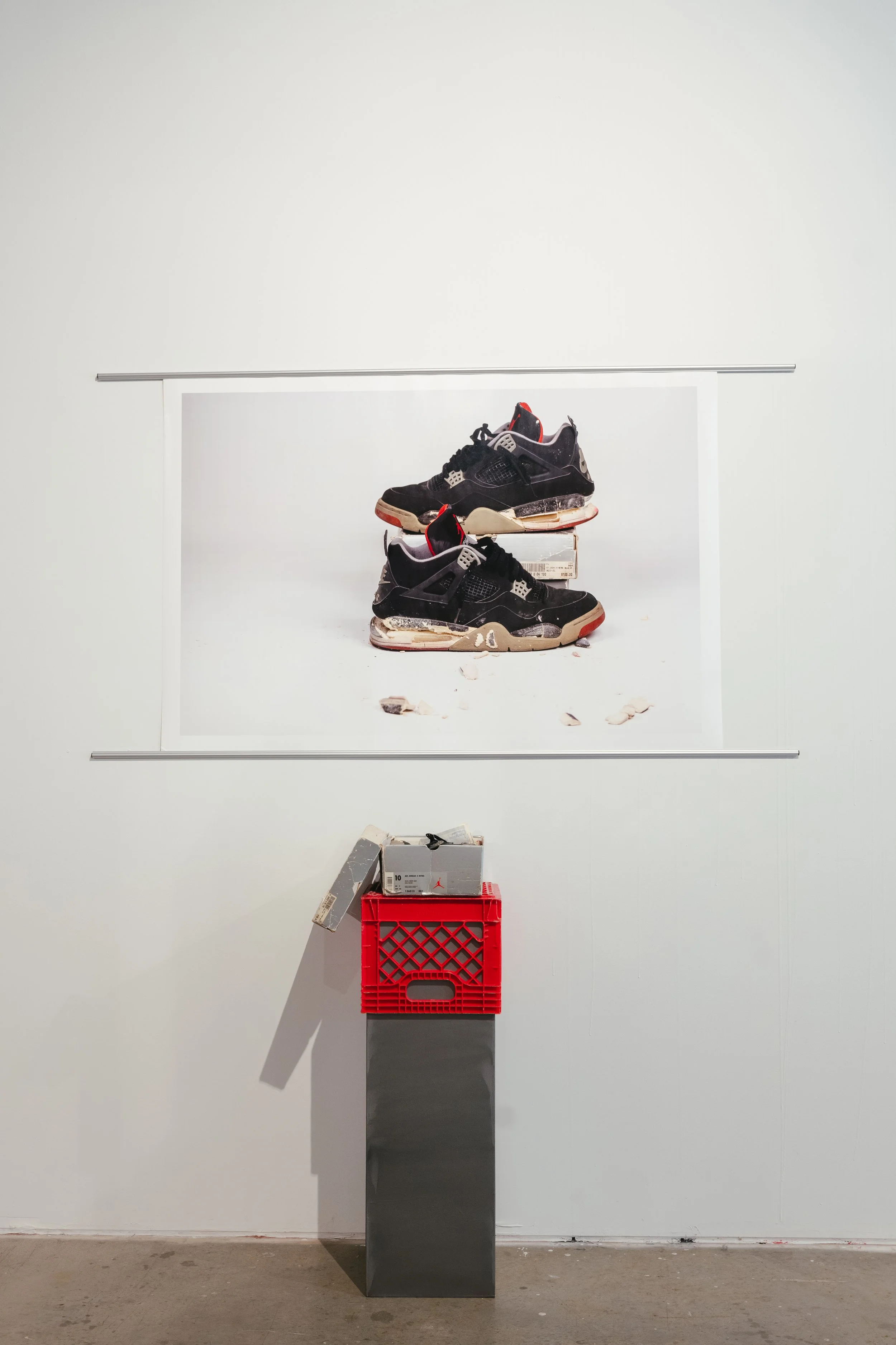 My presentation, Sole Cycle, included 25 images, 3 large prints (36x48), 22 images applied using wheatpaste (4 images - grid format [36 x 48], 6 images [18 x 27], 12 images [8.5 x 14]). The use of wheatpaste is a nod to guerrilla marketing and how these items are marketed and promoted to us, across genres (sneakers, sports, music, etc.). My choice to photograph these specific sneakers was due to their historical importance, as well as their personal significance to me.