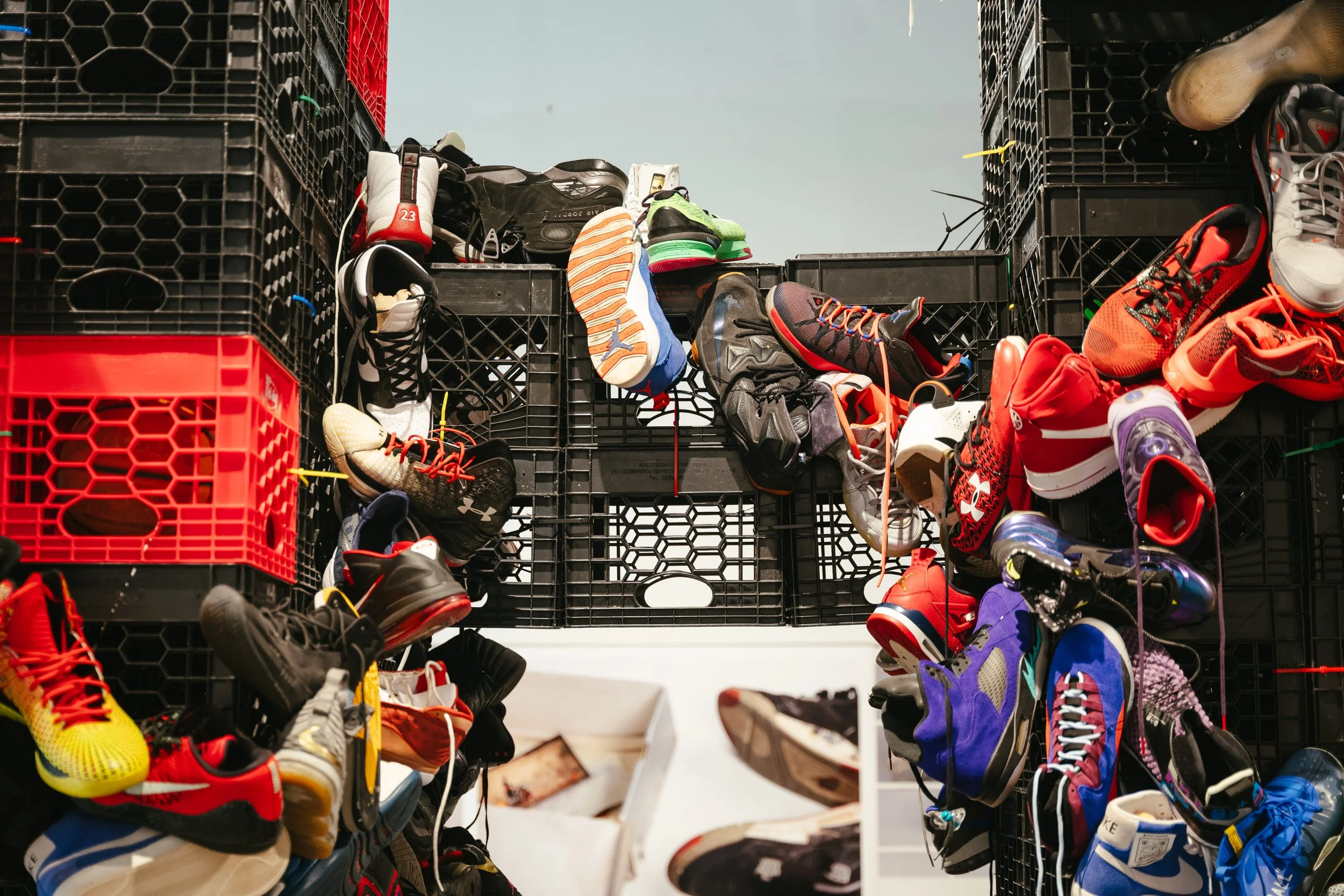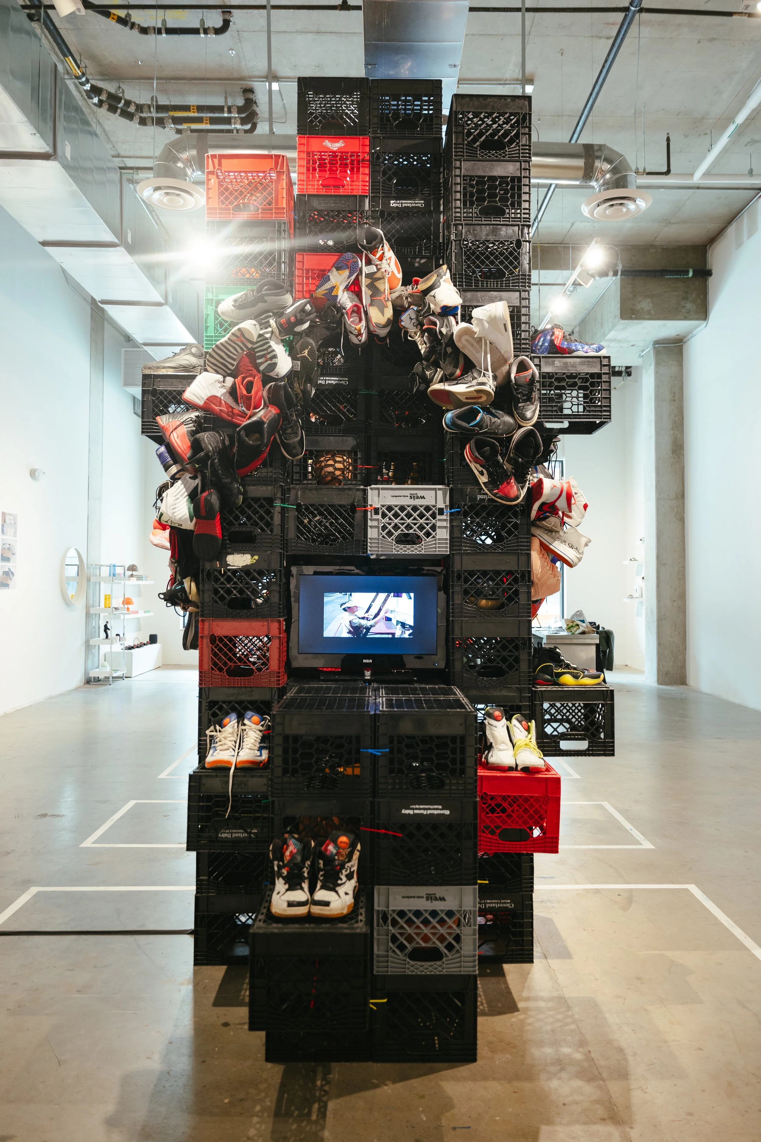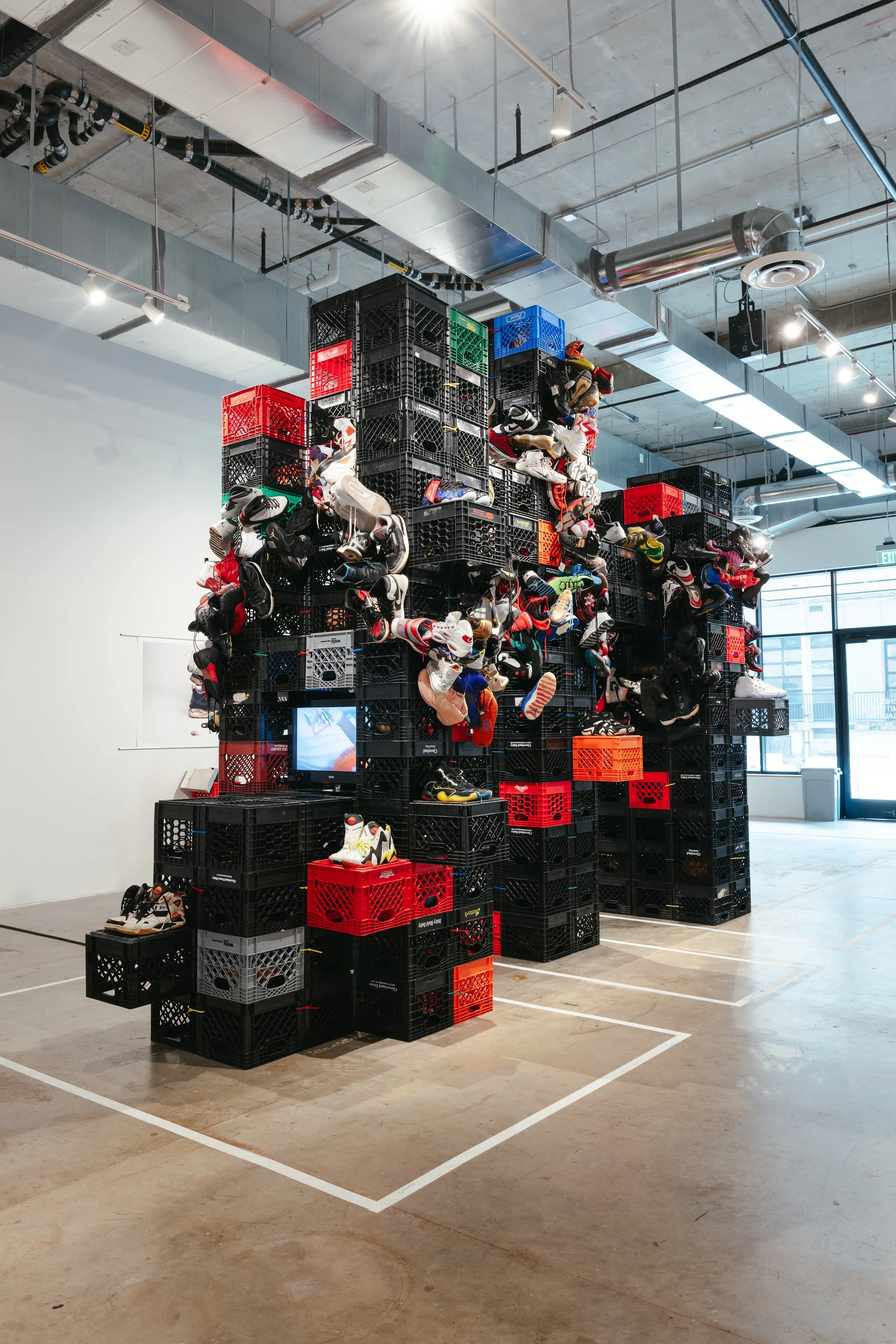 Seawood’s untitled sculptural installation expands this reverence into monumental form— standing at 13’1 ft (18’7 x 6’1 x 13’1 ft to be exact), the artist used milk crates and zip ties to create wire-bound sneaker towers, mirroring urban city landscapes. Adorned with worn basketball sneakers, collected through donations from her community, the size of the structure invites you to explore, looking at each shoe, from different angles, to find the hidden meanings throughout. Basketballs were also included, inhabiting some of the milk crates, as easter eggs for the viewer to discover while exploring, (and checking off your list on the scavenger hunt, created by Seawood). At the rear of the structure, a TV screen is located, playing on loop, classic basketball sneaker commercials, showing how over time, more and more of “our” culture was used to sell these items, specifically targeting certain demographics